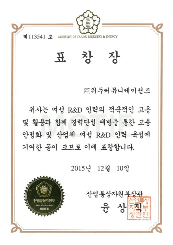 산업통상자원부 표창장 페이지 정보 작성자 WeDu 댓글 0건 조회 5,038회 작성일 19-05-30 19:34 본문 2015-12-10 표창장 제 113541호 여성 R&D 인력 고용 산업통상자원부장관 윤상직 List Previous서울클러스터 어워드 우수상 19.05.30 Next감사장 제 143호 19.05.30