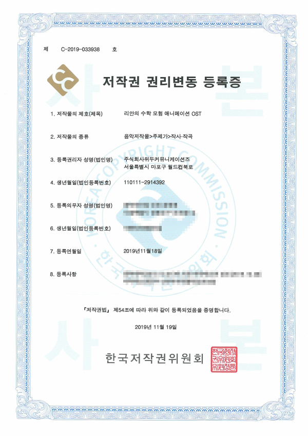[한국/저작권] 리안의 수학 모험 애니메이션 OST 페이지 정보 작성자 WeDu 댓글 0건 조회 5,585회 작성일 19-11-25 13:54 본문 2019-11-18 저작권 C-2019-033938 음악저작물>주제가>작사·작곡 List Previous[한국/저작권] 리안의 수학 모험 여정의 시작 1,2,3,4,5 21.12.31 Next[한국/저작권] 애니메이션 리안의 수학 모험 19.11.25